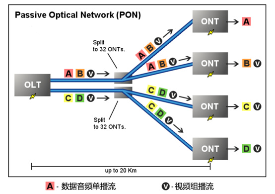 PON體系由多個光網絡單元(ONU),一個光線路終端(OLT)和一個或多個分光器組成(見下圖)。在下行方向,OLT所發送的信號播送到一切的ONU上。在上行方向,選用TDMA多址接入技能,多個ONU的上行信息組成一個TDM信息撒播送到OLT。