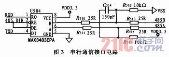 溫濕度模塊數據傳輸采用RS485總線形式,RS485總線采用EIA/TIA-485標準的2線制電氣接口,具有抗共模干擾能力強,多機通信和組建現場總線網絡的功能,傳輸距離理論值可達1 200 m,在實際工程中通信距離可達800 m左右,是目前工程中應用最多的通信方式。在溫濕度采集終端,單片機工作電壓為5 V,故選用MAX485芯片做電平轉換,單片機AT89S52的串口TXD和RXD分別連接MAX485的DI和RO引腳,完成數據的發送與接收。在數據接收端,ARM7系列LPC2114工作電壓為33 V,故選用MAX3483低功耗芯片做電平轉換,LPC2114的TXD0和RXD0分別連接MAX34 83的DI和RO引腳,完成數據的接收與發送。由于RS485的A、B兩端為差分信號,所以兩種485芯片的A、B兩端可直接相連。LPC2114的2個串口都具有串口中斷方式,UART0負責接收溫濕度采集數據,UART1負責與無線模塊通信,兩路串口都支持CPU與外設之間的異步串行數字通信,支持5~8位串行數據傳送與接收,每一個通道有2個16位FIFO,系統采用串口接收的中斷方式。在串口通信中接收每幀數據包后,對數據幀進行解析,判斷數據是否為報警數據。串行通信接口電路如圖3所示。