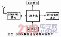 GPRS數據通信終端是基于移動通信網絡,針對工業監控、交通管理、金融等行業數據通信的應用開發的。與數據中心的接口設備一起提供透明數據傳輸通道,組成用戶專用數據網絡。GPRS數據通信終端原理框圖如圖2所示。