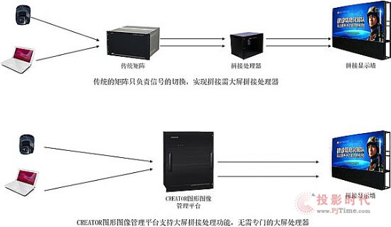 傳統的處理方案是必需要裝備拼接處理器銜接到大屏來完結這些拼接作用,這種方法構成全部體系構造非常復雜不利于運用和保護,并且矩陣到拼接處理器之間也存在不一樣品牌商品的兼容性疑問,一起用戶的建形本錢也比較高。選用圖形圖畫辦理渠道具有有圖畫拼接處理的功用,經過渠道的拼接輸出卡直接接入大屏即可完結圖畫的拼接,窗口,周游和形式的調用等作用。