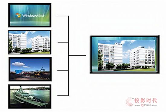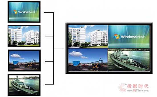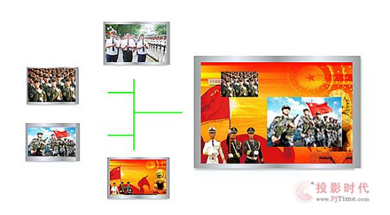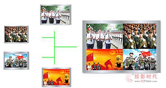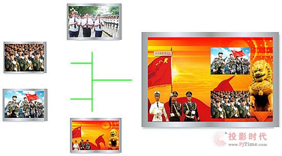 多畫面顯現形式下,不一樣輸入視窗只占據輸出視窗的一部分,顯現作用如下圖。